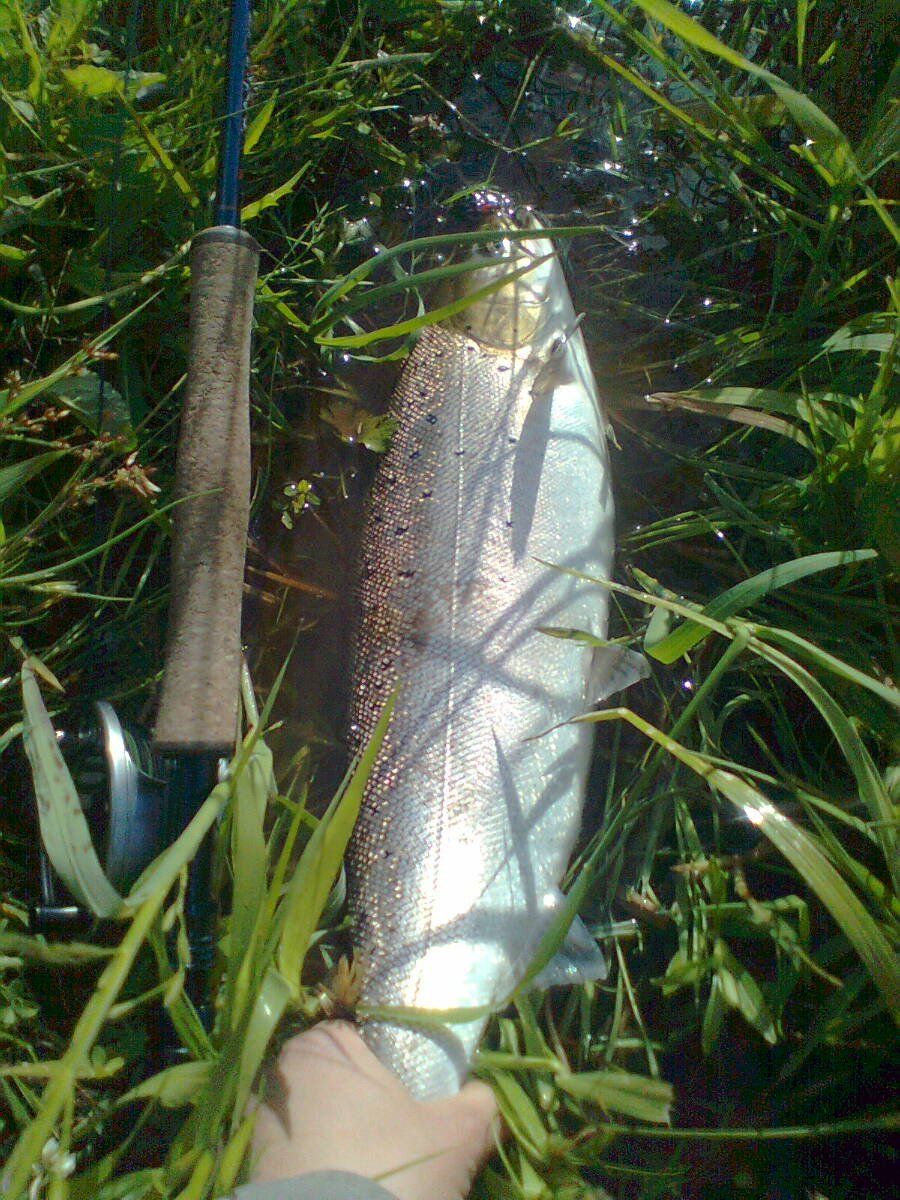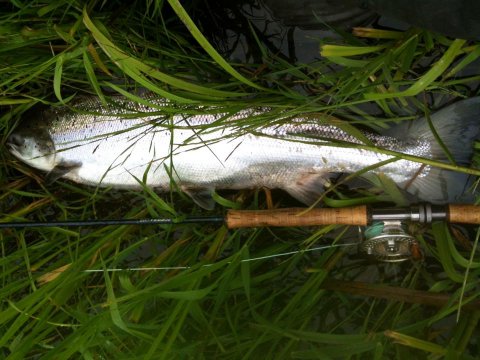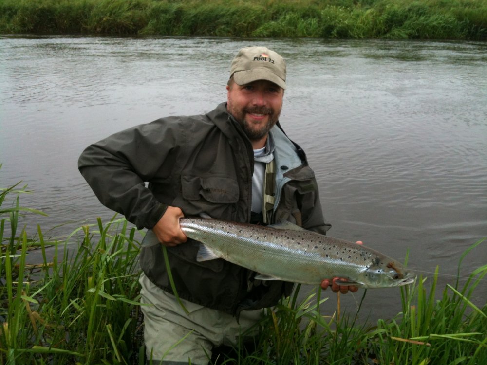 Fin blanklaks med lus på ca. 80 cm fanget i Skjernå 25 juli.